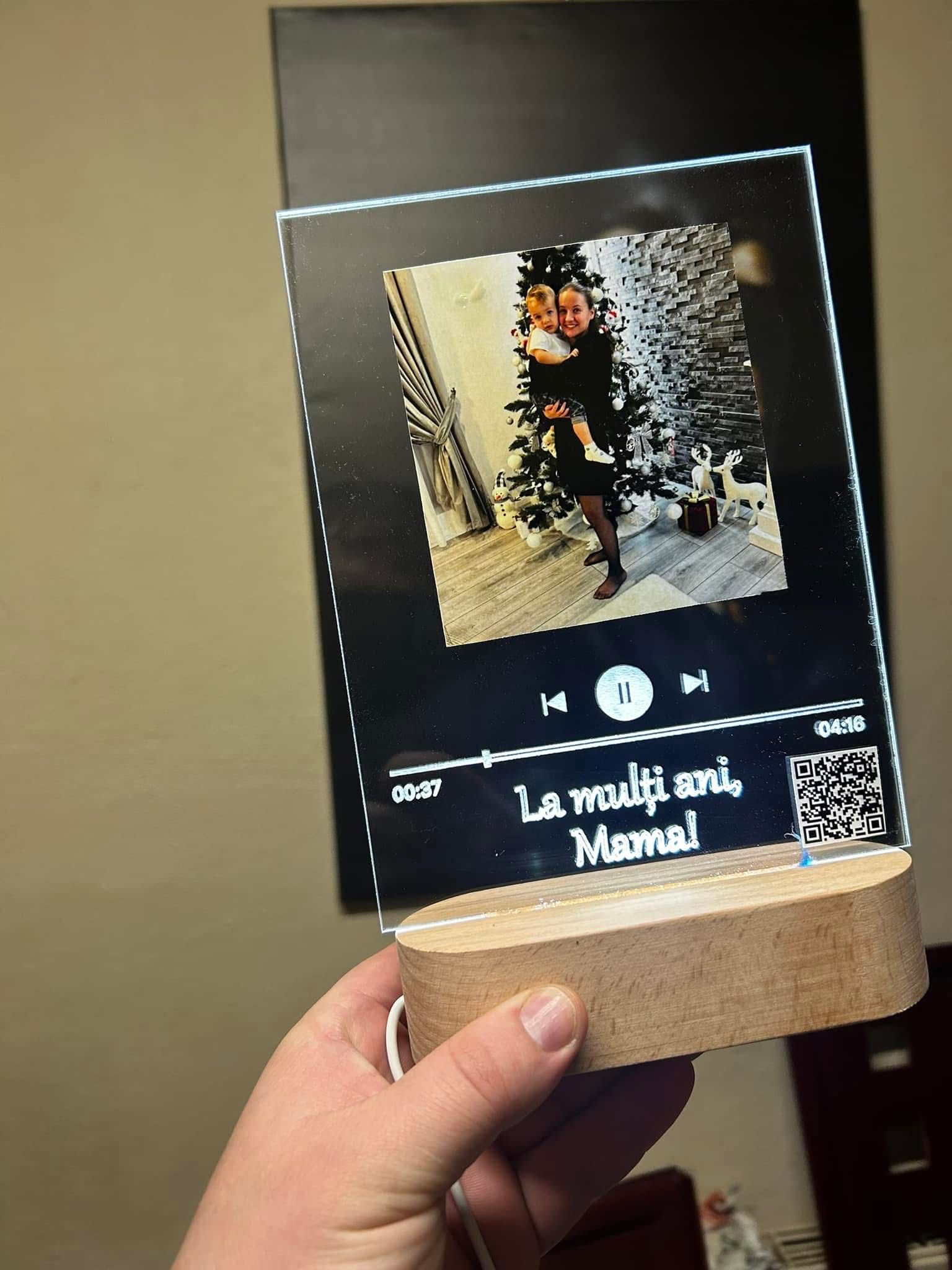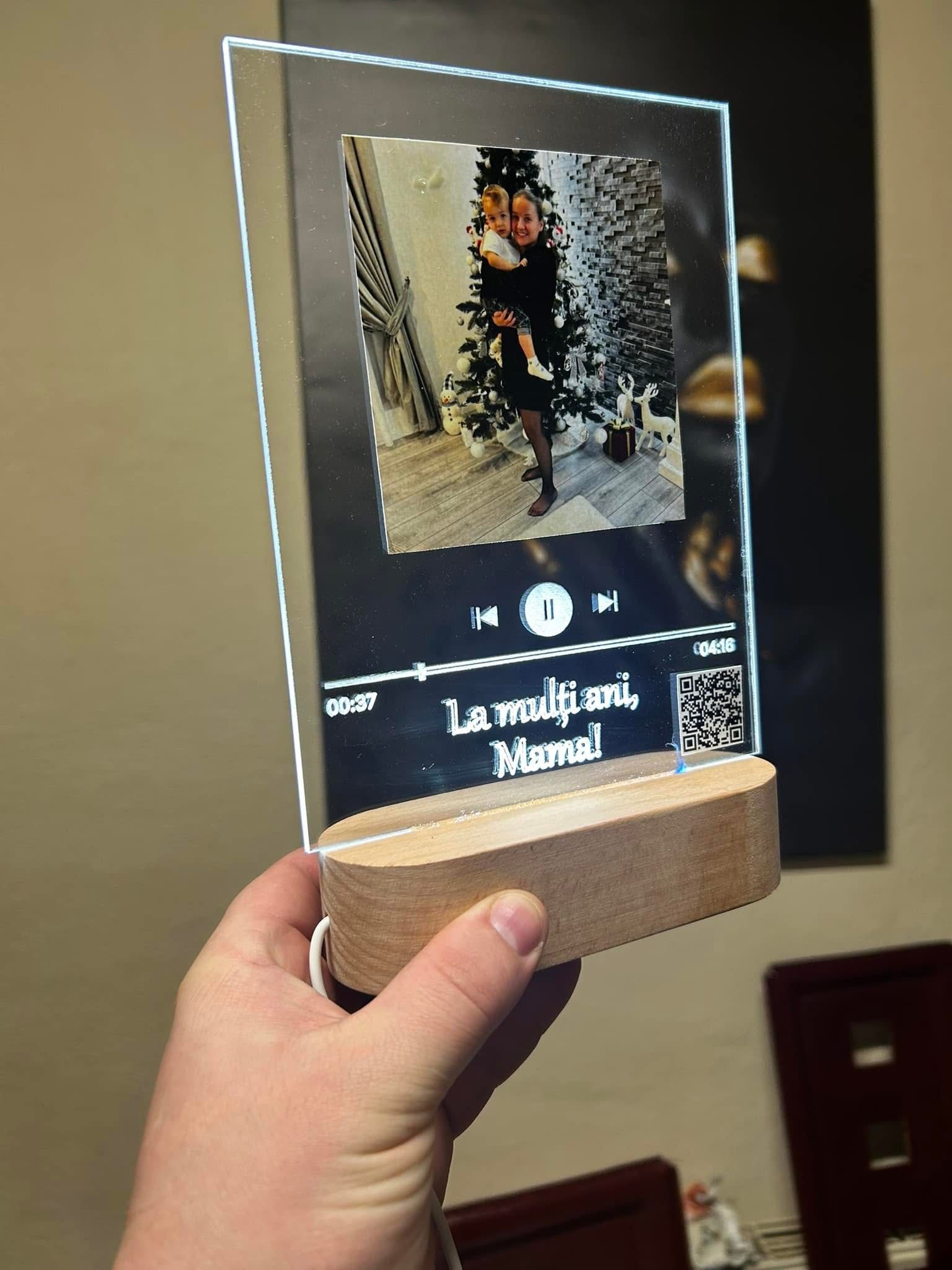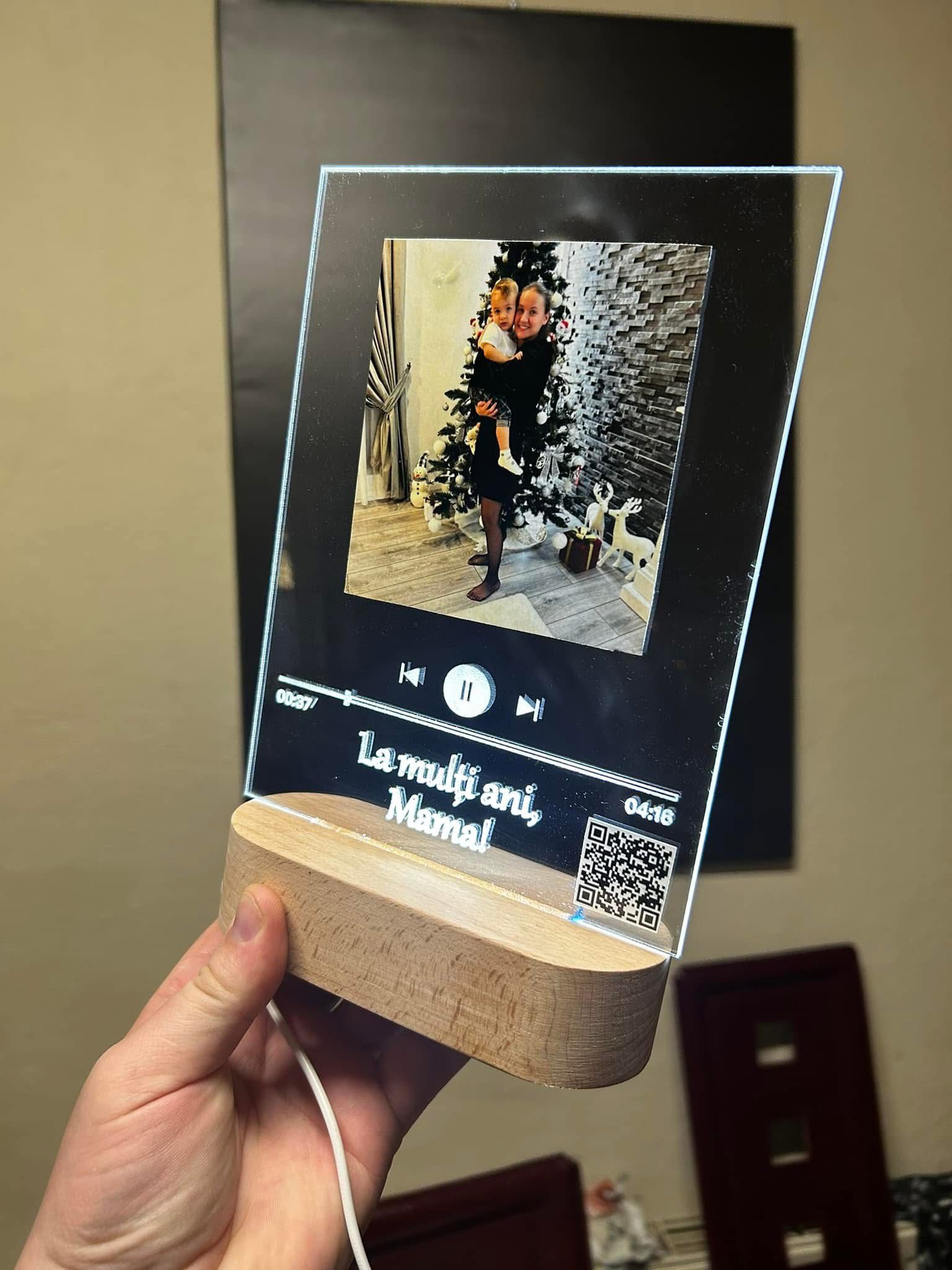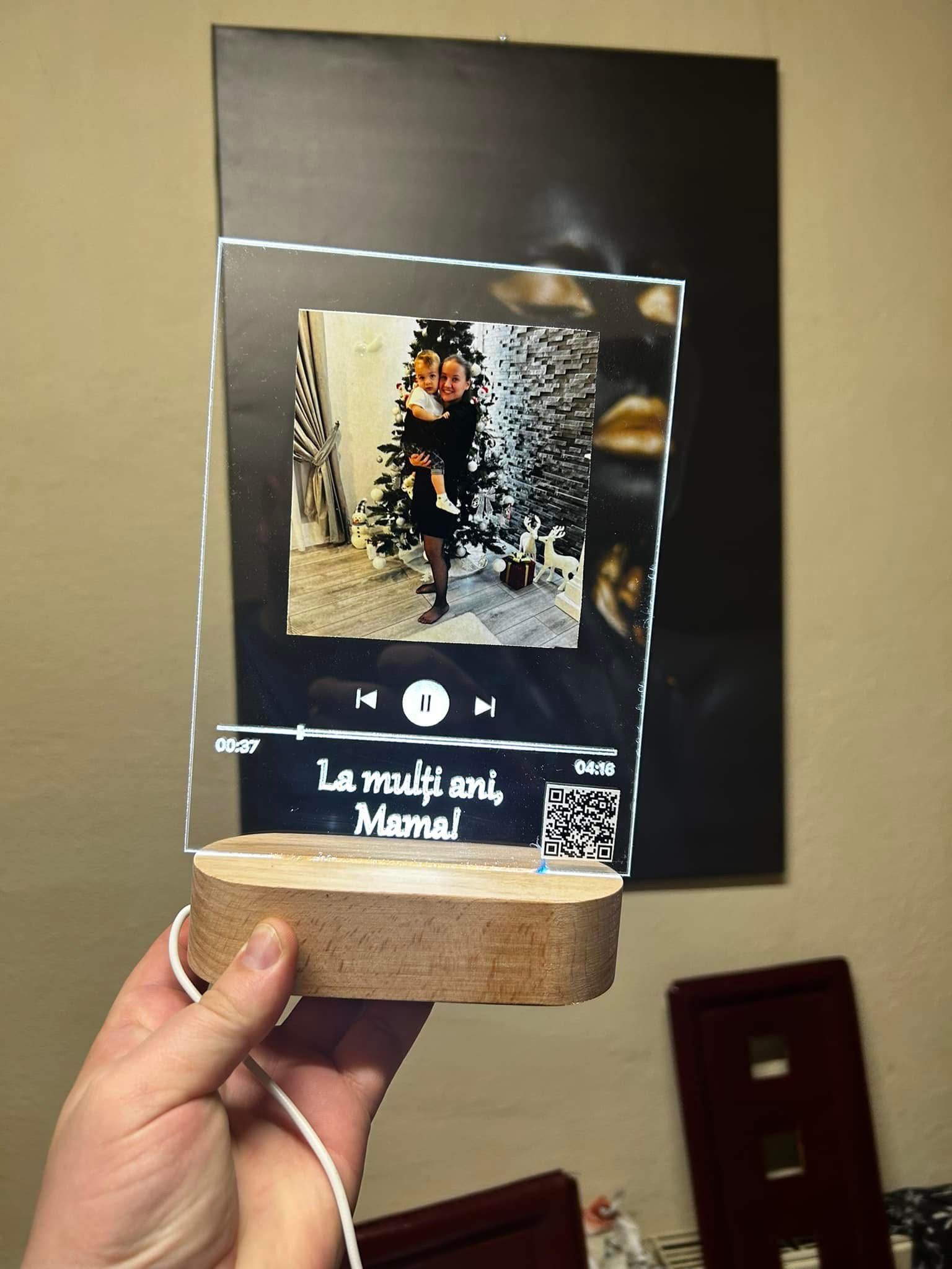 Realizată din acril de calitate și cu suport din lemn natural, lampa oferă un efect vizual spectaculos atunci când este iluminată cu LED. Poți adăuga poza preferată, nume, un mesaj personalizat și chiar un cod QR care redă melodia voastră specială.