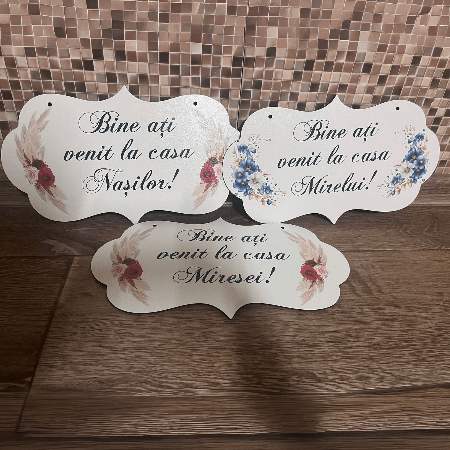 Această plăcuță decorativă personalizată, formă elegantă, este perfectă pentru a întâmpina invitații la nuntă. Realizată din materiale rezistente și imprimată cu tehnologie de calitate, poate fi personalizată cu text și dată la alegere, oferind o notă unică oricărei ocazii.