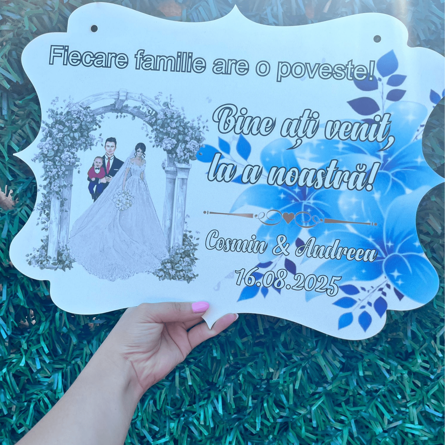 Această plăcuță decorativă personalizată, cu design floral albastru și formă elegantă, este perfectă pentru a întâmpina invitații la nuntă. Realizată din materiale rezistente și imprimată cu tehnologie de calitate, poate fi personalizată cu text și dată la alegere, oferind o notă unică oricărei ocazii.