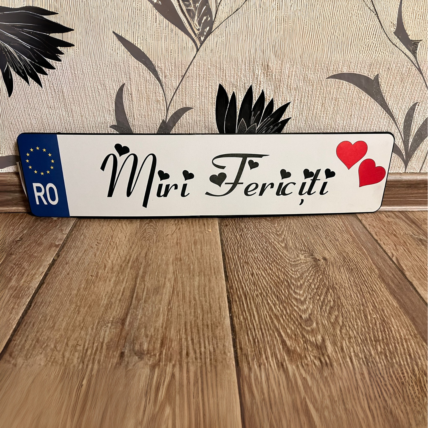 Inspirată de designul plăcuțelor de înmatriculare, dar cu mesaj simbolic și inimi roșii, este ideală pentru ședințe foto, evenimente și cadouri tematice.