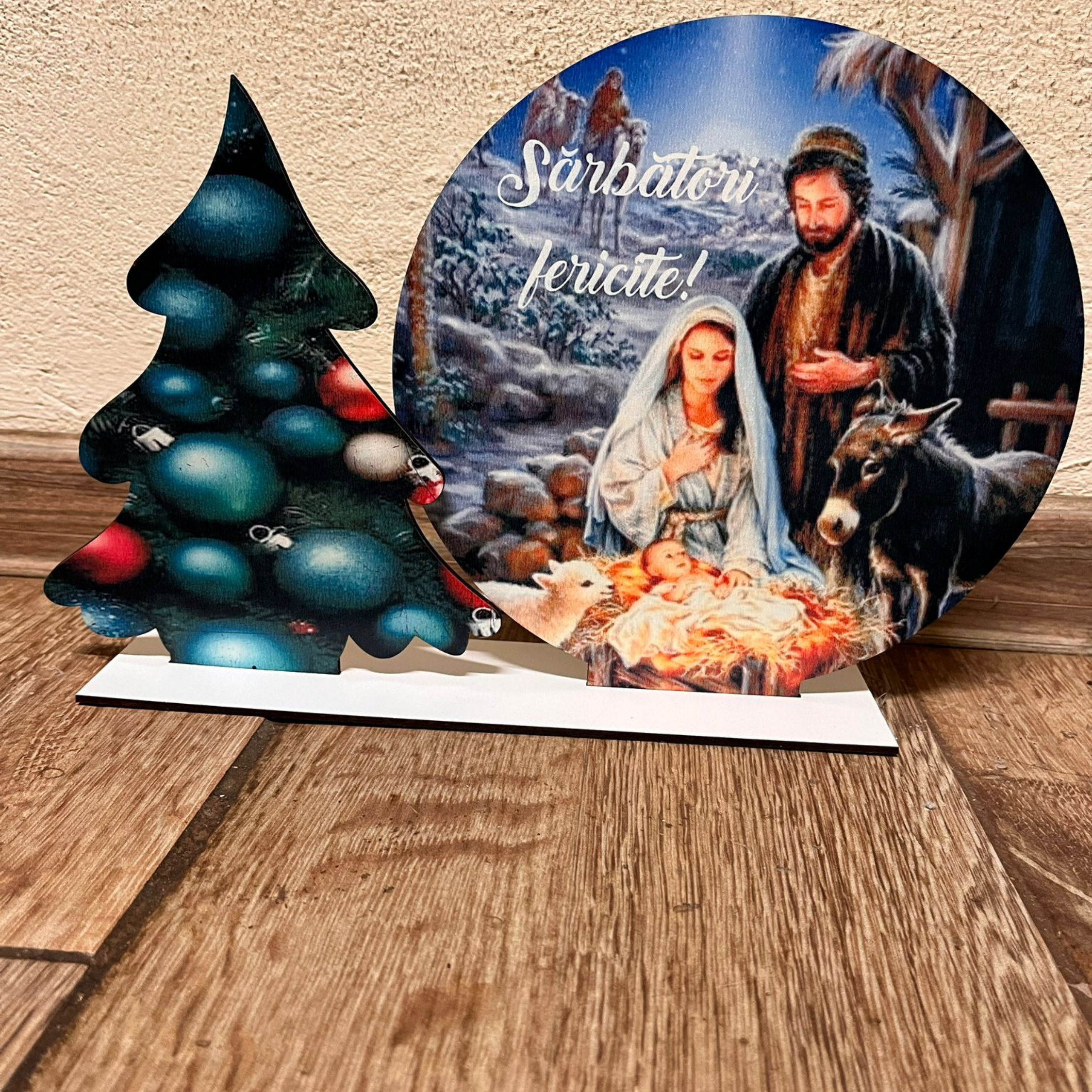 Suport decorativ de Crăciun cu Nașterea Domnului și brad imprimat – „Sărbători fericite!”