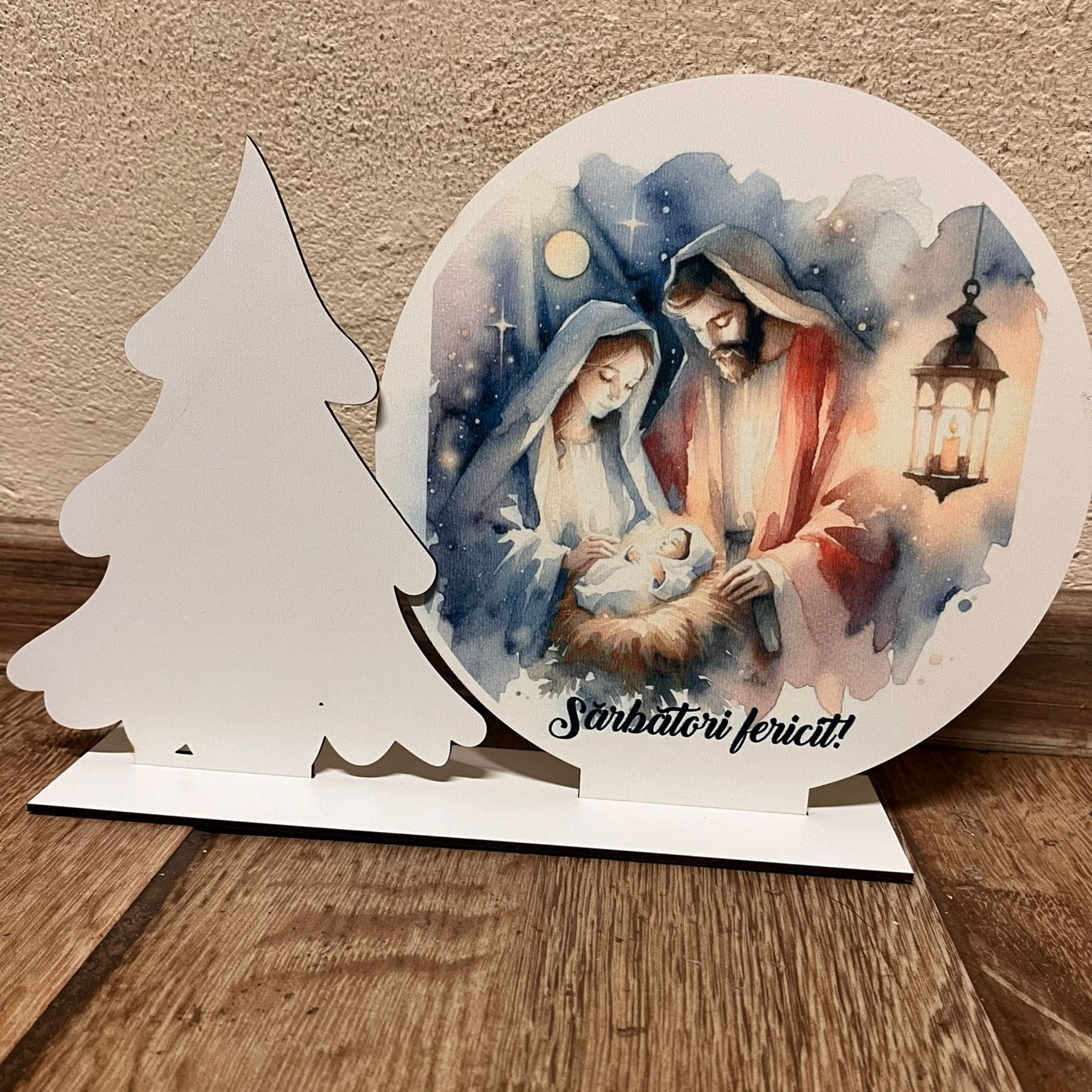 Suport decorativ de Crăciun cu scenă în acuarelă a Nașterii Domnului și brad alb – „Sărbători fericite!”