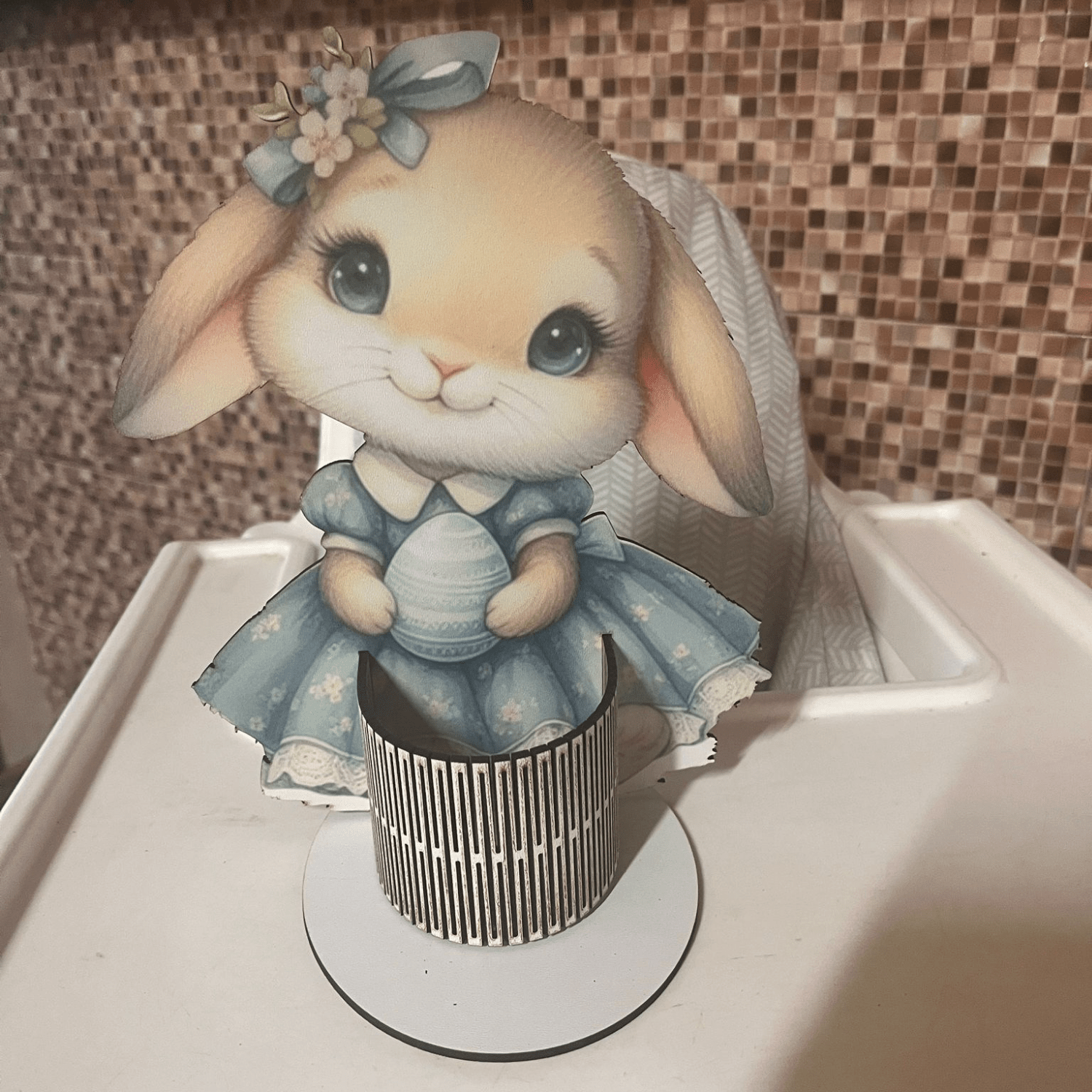 Suport decorativ din MDF pentru ou sau dulciuri – model festiv cu iepuraș.