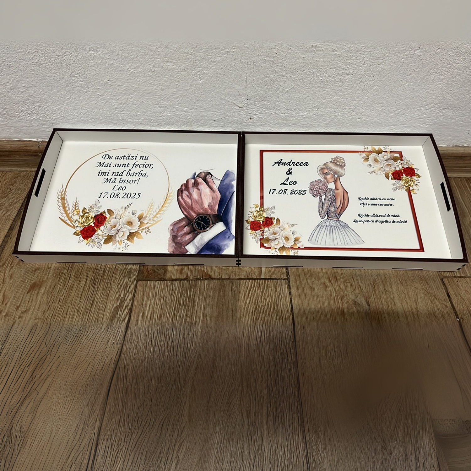 Această tavă decorativă personalizată, cu design floral romantic, este realizată cu atenție la detalii pentru a adăuga un plus de eleganță oricărei mirese/ oricarui mire. Fabricată din materiale de calitate, poate fi personalizată cu text la alegere.